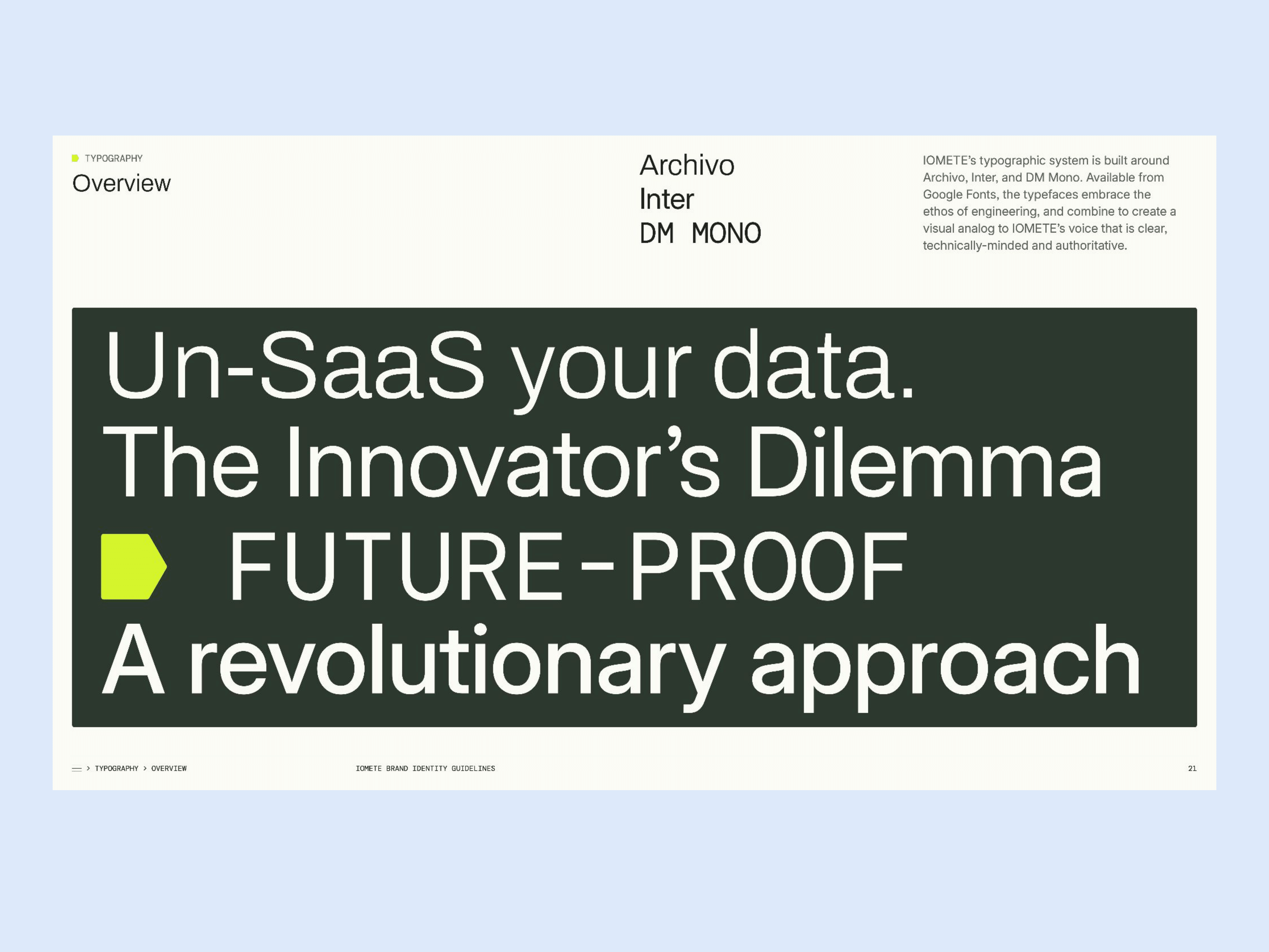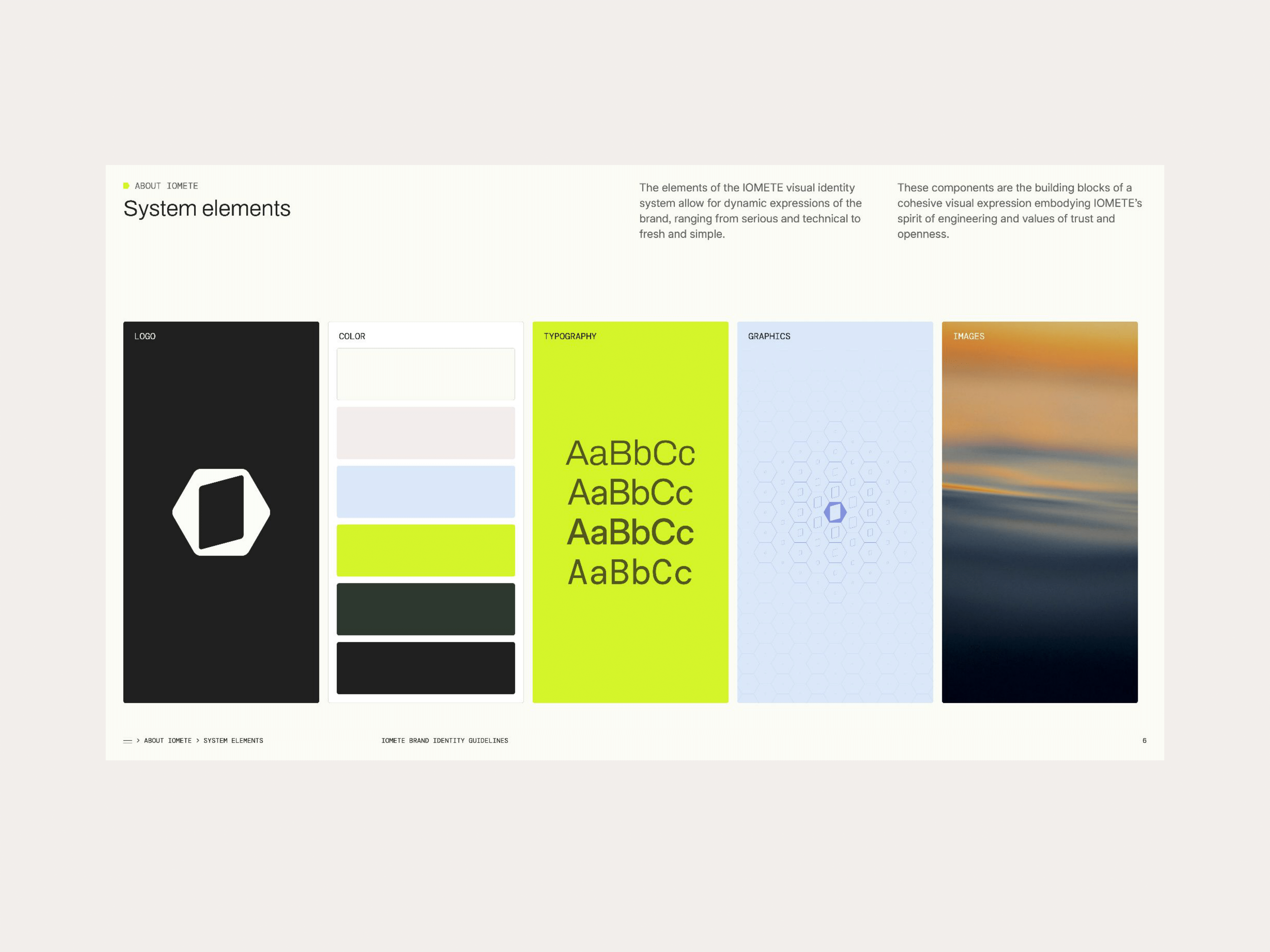 Updated branding and visual identity system for IOMETE, a next generation data platform built by engineers for engineers. The identity system’s components form the building blocks of a cohesive visual expression that encapsulates IOMETE’s spirit of engineering and values of trust and openness. Adapting seamlessly across multiple digital touchpoints, the visual identity allows for dynamic expressions of the brand, from serious and technical to fresh and simple.